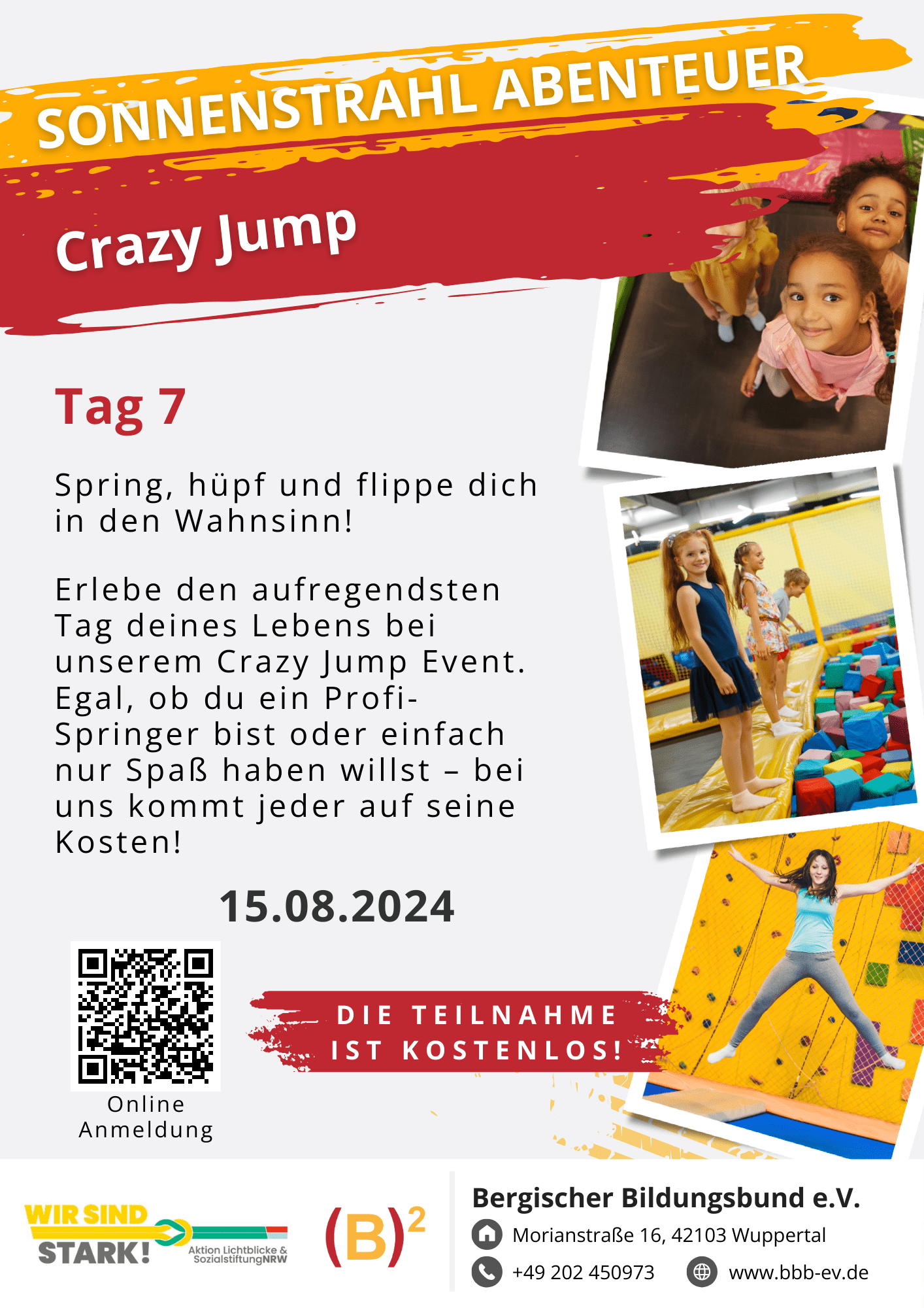 Spring, hüpf und flippe dich in den Wahnsinn! Erlebe den aufregendsten Tag deines Lebens bei unserem Crazy Jump Event. Egal, ob du ein Profi-Springer bist oder einfach nur Spaß haben willst – bei uns kommt jeder auf seine Kosten!